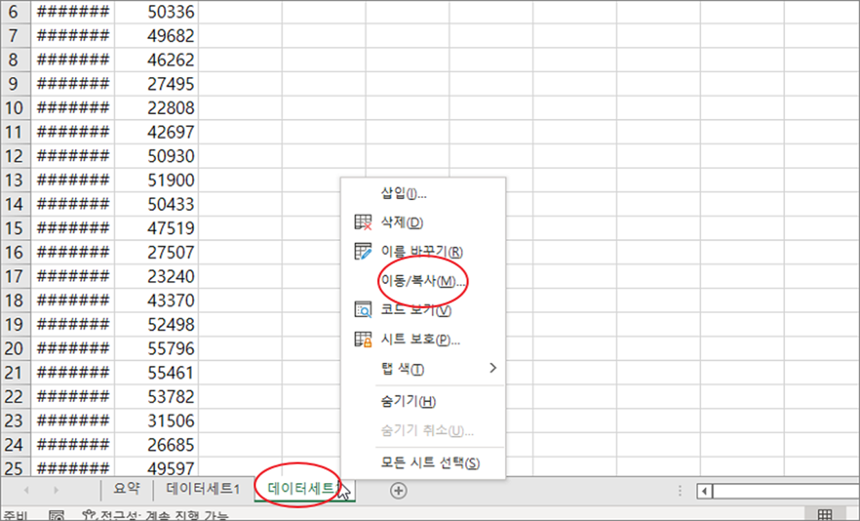 ▼ 먼저 저장하고 싶은 워크시트를 선택합니다. 그리고 시트에서 오른쪽 마우스를 클릭하면 단축메뉴가 나오게 되는데, “이동/복사” 를 선택합니다.