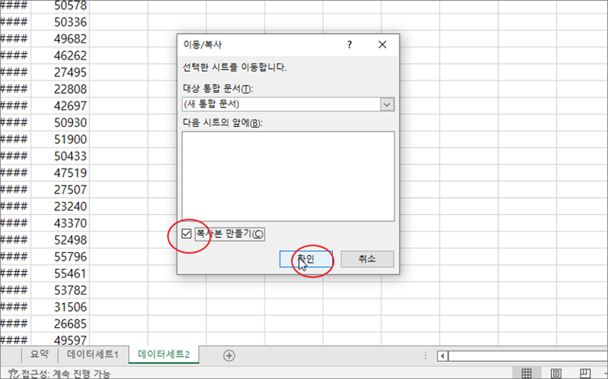 ▼ 그런데 문서가 아닌 [새 통합 문서] 를 클릭하면 새로 문서를 만듭니다. 이동/복사 대화상자에서 [새 통합 문서] 를 선택하고 아래쪽에 있는 [복사본 만들기] 체크박스를 클릭합니다. 체크하지 않으면 기존에 있던 워크시트가 사라집니다.