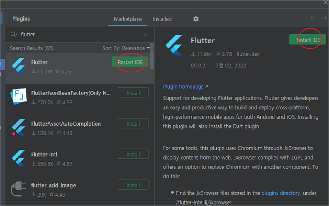▼ 그림처럼 설치가 끝나면 Install 버튼 대신 Restart IDE 라는 이름으로 버튼명이 바뀝니다. 버튼을 클릭해서 안드로이드 스튜디오를 재시작합니다.