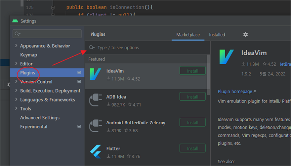 ▼ settings 화면에서 사이드 메뉴에 Plugins 을 찾습니다. Plugins 화면 상단에 검색란을 이용해서 원하는 플러그인을 찾습니다.