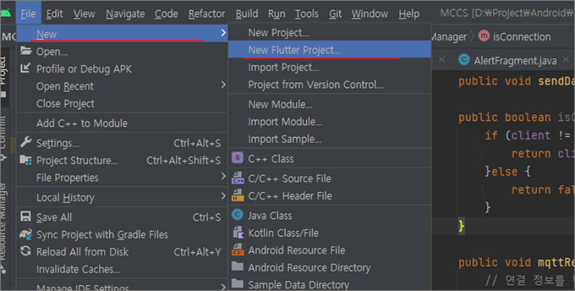 ▼ 제대로 설치가 되었다면 바로 메뉴에서 확인이 가능합니다. 플러터 같은 경우 프로젝트 생성이 가능한 메뉴가 추가가 됩니다. File > New > New Flutter Project 가 있는지 확인합니다.