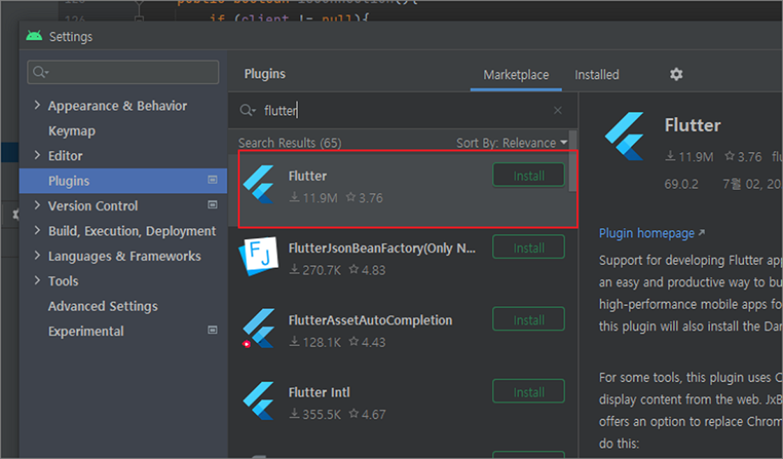 ▼ 플러그인 목록에서 Flutter 를 찾았다면 오른쪽 끝에 Install 버튼을 클릭합니다.