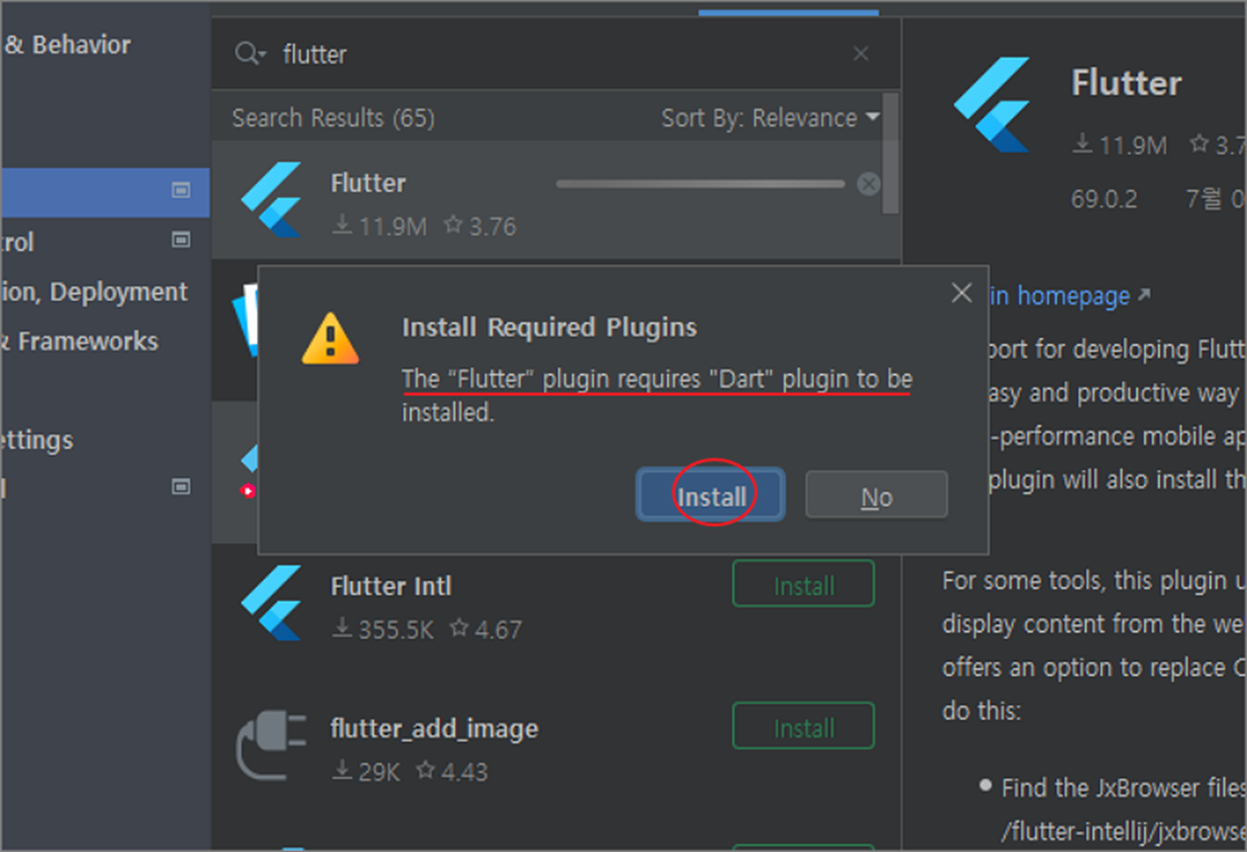 ▼ 플러그인 설치 과정에서 추가 플러그인 설치가 필요할 수도 있습니다. Flutter 는 Dart 라는 언어를 사용하기 때문에 Dart 플러그인도 설치를 해야 합니다.