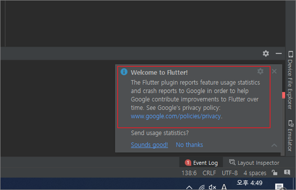 ▼ 프로그램 재시작이 성공적으로 이루어지면 오른쪽 하단에 Welcome to Flutter 라는 문구의 메시지 창이 뜰 겁니다. 성공적으로 설치가 완료되었다는 의미입니다.