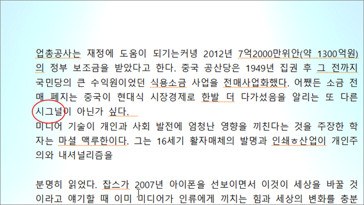 ▼ 사전에 추가한 단어는 문서에서 빨간 줄로 표시하지 않습니다. 하지만 한글 프로그램을 다시 설치하면 모든 단어는 초기화가 되기 때문에 새로 추가해야 합니다.