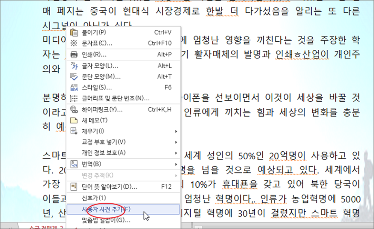▼ 세 번째는 맞춤법 검사/교정에서 제공하는 단어가 적합하지 않은 경우 오류 단어를 사전에 추가하는 방법입니다. 대치어를 새로 추가하는 것입니다. 빨간 줄 표시에서 오른쪽 마우스 > 사용자 사전 추가 메뉴를 클릭합니다.