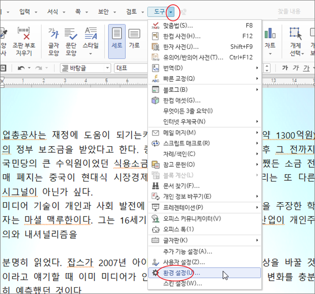 ▼ 첫 번째 방법은 한글에도 동작하고 있는 맞춤법 도우미 자체를 끄는 것입니다. 방법은 간단합니다. 환경설정에서 체크 하나만 풀면 됩니다. 상단 도구 > 환경설정 메뉴를 클릭합니다.