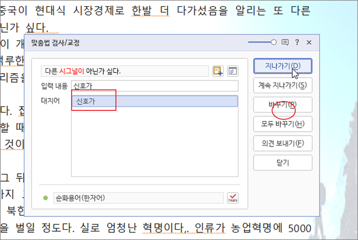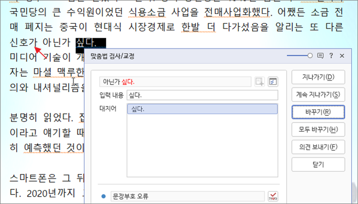 ▼ 맞춤법 검사/교정 창이 뜨면 대부분 대치어를 볼 수 있습니다. 한글 사전에서 제공하는 맞춤법에 맞는 단어입니다. 물론 100% 정확한 것은 아닙니다. 해당 대치어가 맞다고 판단되면 오른쪽 바꾸기 버튼을 눌러 내용을 변경합니다.