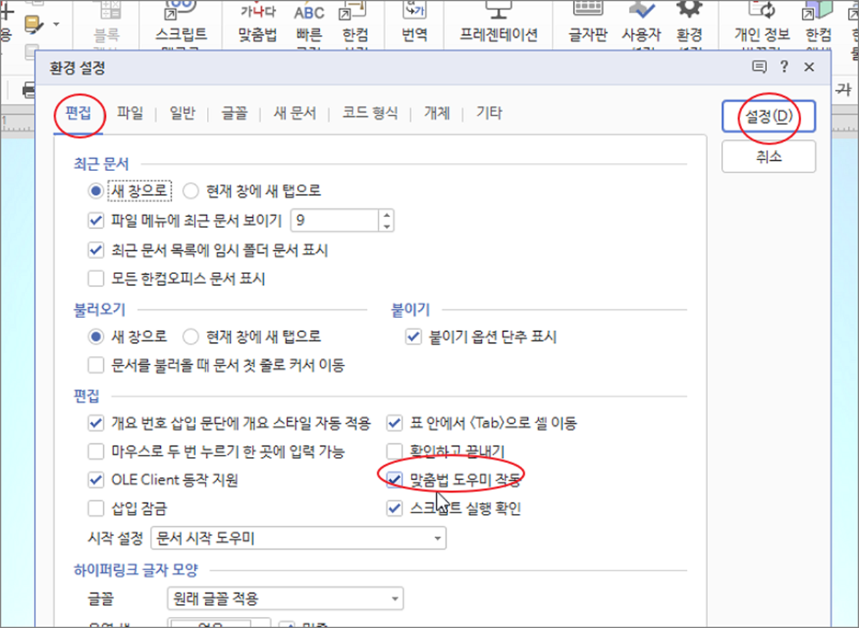 ▼ 환경 설정 팝업 창에서 편집 탭 > 편집 란으로 이동합니다. 그리고 맞춤법 도우미 작동 옵션을 체크해제하고 오른쪽 상단 설정 버튼을 클릭해서 창을 닫습니다.