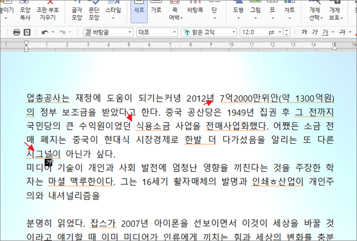 ▼ 그림처럼 한글은 단어에 문제가 있다고 판단되면 빨간 점선으로 밑줄에 표시합니다. 눈에 거슬리는 빨간 줄을 어떻게 없애는지 알아봅시다.