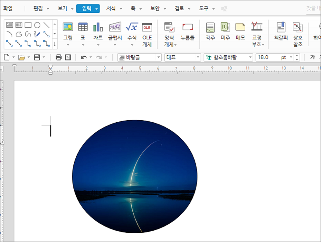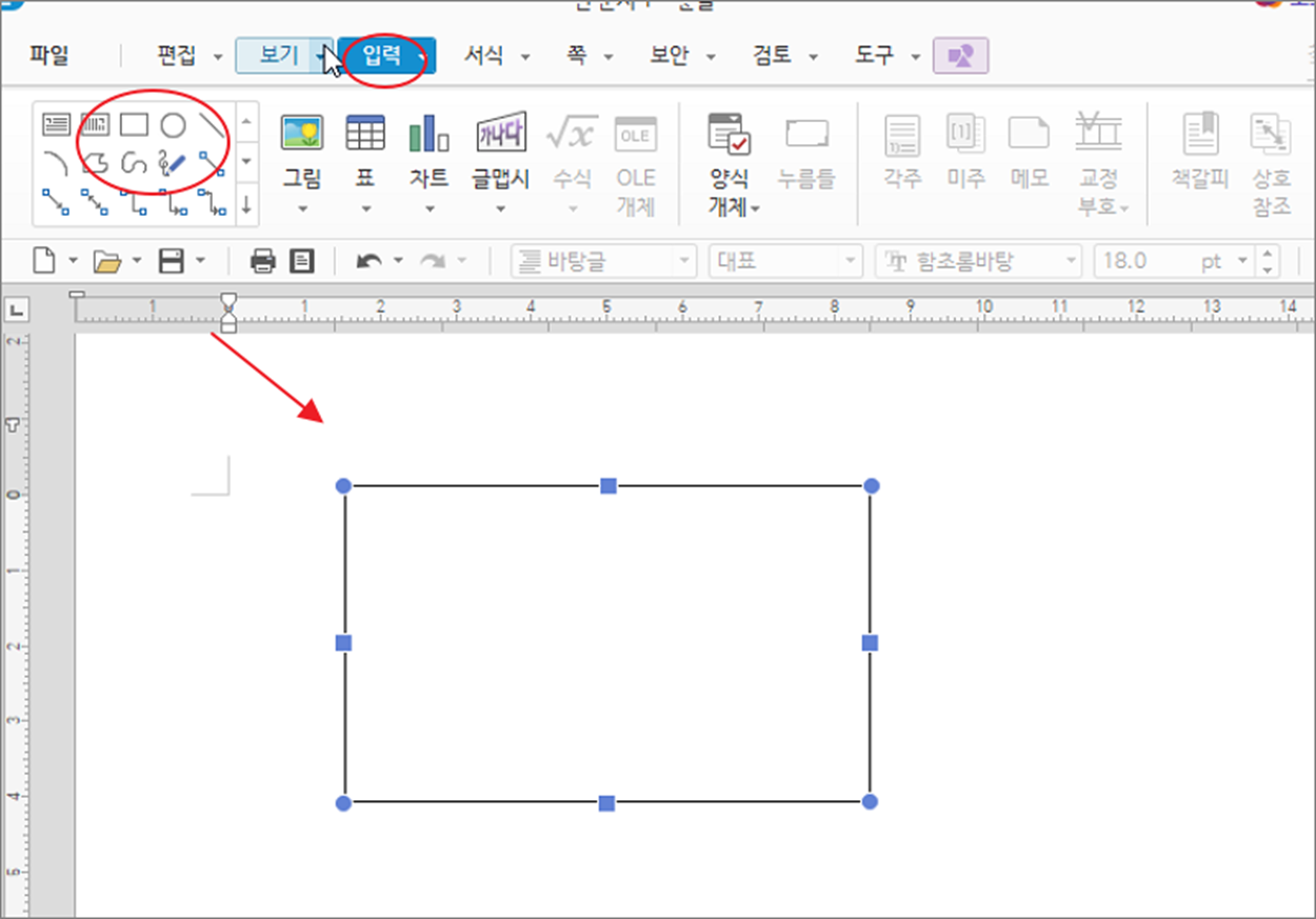 ▼ 먼저 한글 문서에 도형을 추가합니다. 입력 탭 > 도형 목록에서 선택한 후 편집 화면에 추가합니다.