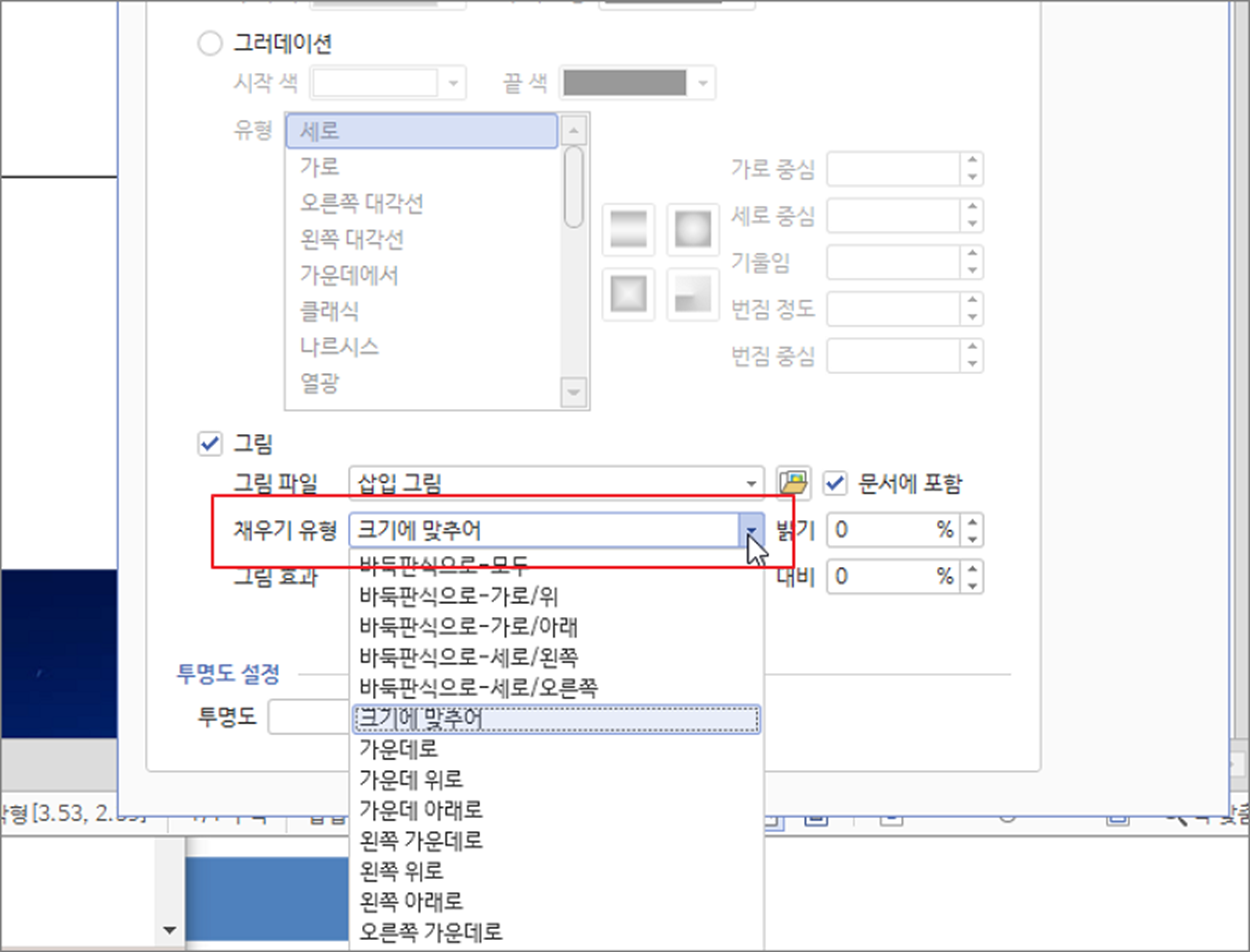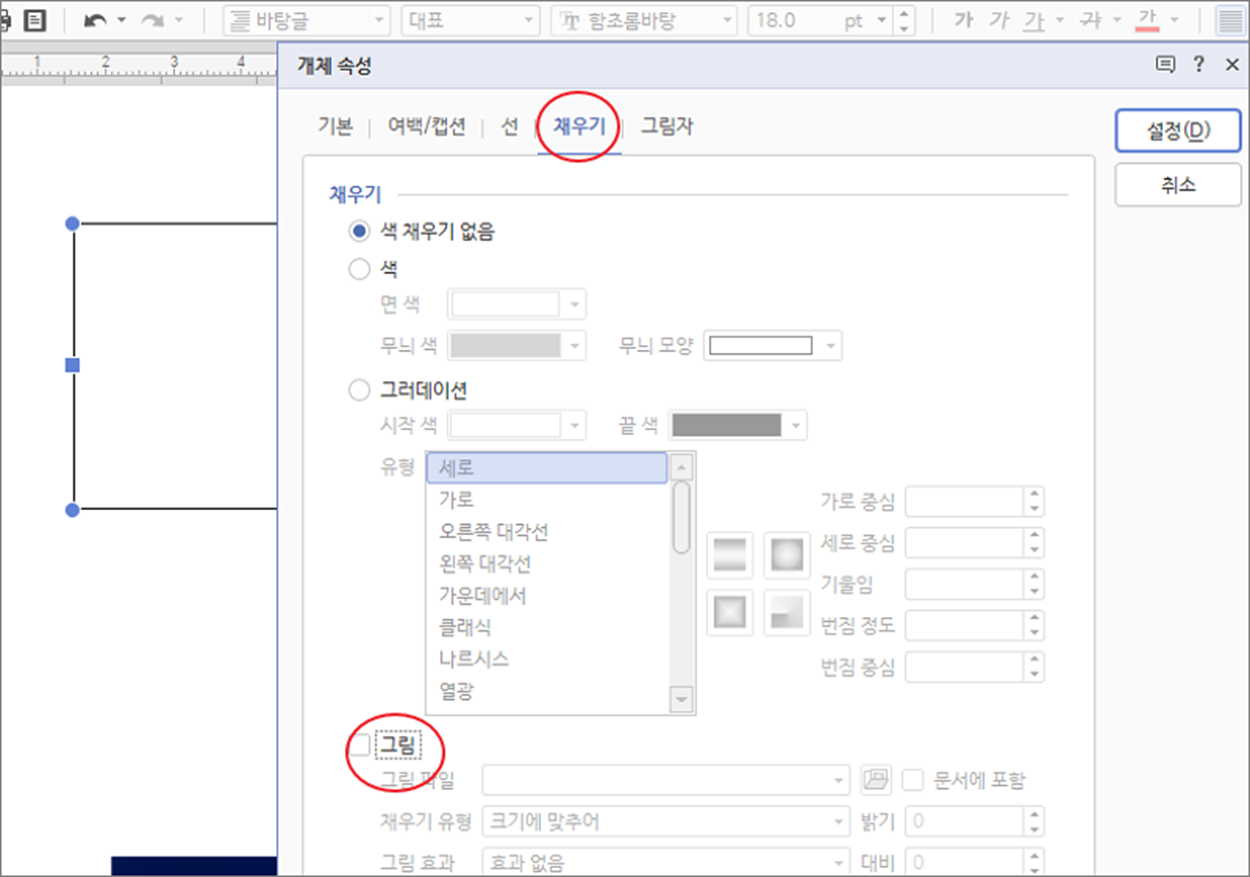 ▼ 개체 속성 팝업창이 뜨면 채우기 탭으로 갑니다. 그리고 아래로 내려가서 그림 옵션을 체크합니다.