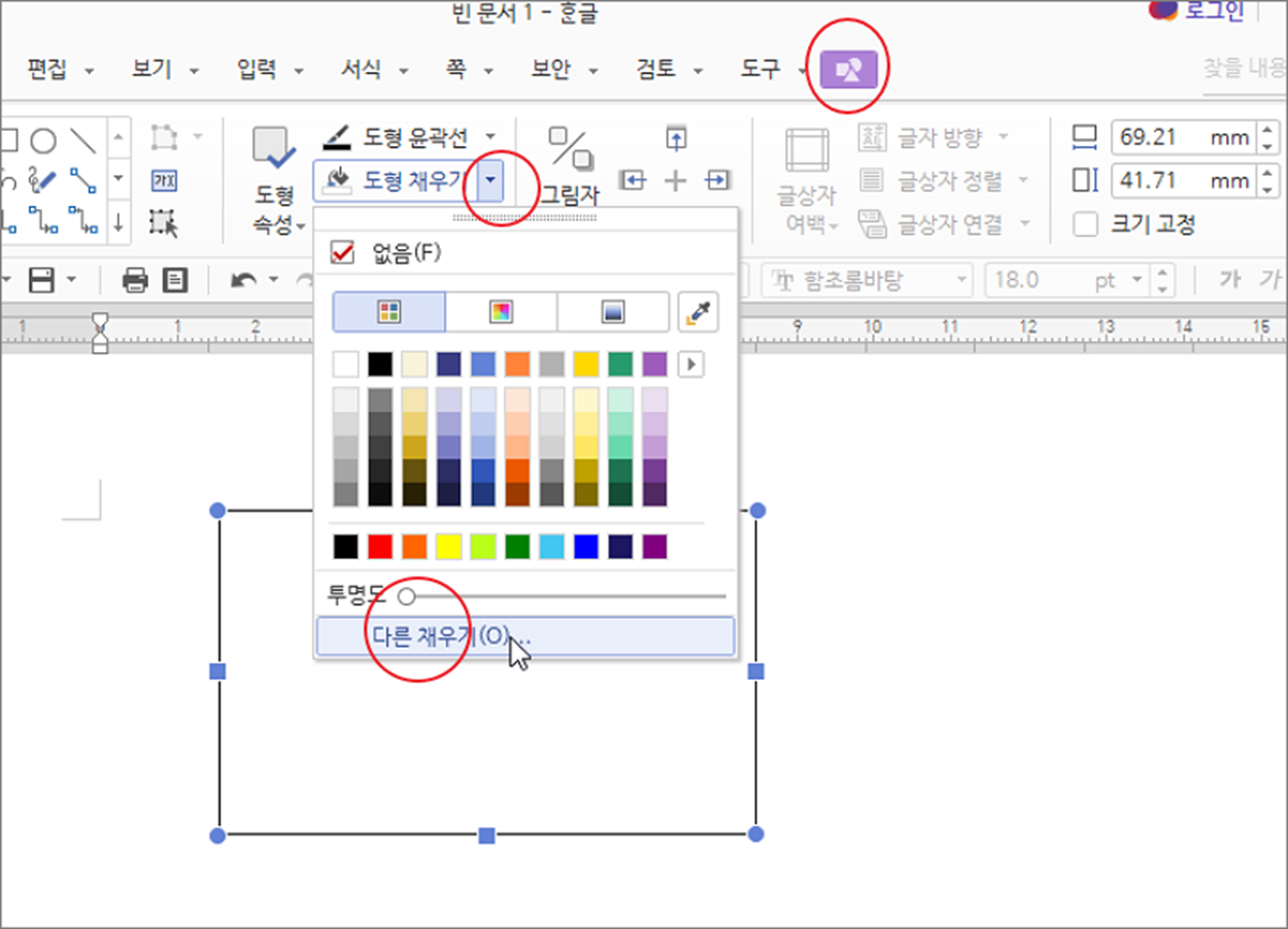 ▼ 이렇게 추가한 도형을 선택합니다. 화면 상단에 뜬 도형 속성 탭을 선택하고 도형 채우기 옵션 옆에 화살표를 클릭합니다. 다음 화면에 뜬 팝업창 하단에 다른 채우기 메뉴를 클릭합니다.