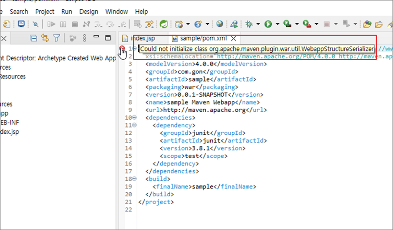 Could not initialize class org.apache.maven.plugin.war.util.WebappStructureSerializer pom.xml /sample line 1 Maven Configuration Problem