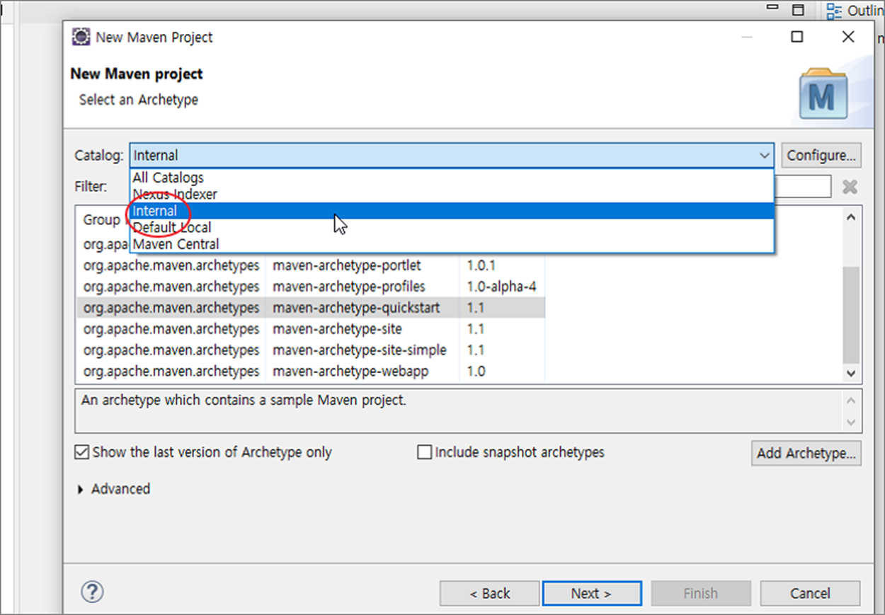 ▼ 기본 프로젝트 타입을 지정합니다. Archetype 는 메이븐에서 제공하는 템플릿입니다. 개발하고자 하는 프로젝트의 타입을 골라 선택하면 기본 구조를 자동으로 만들어 줍니다. Web 어플리케이션을 만들어야 하기 때문에 maven-archetype-webapp 를 찾아야 합니다. 목록에서 좀 더 쉽게 찾고 싶다면 Catalog 을 이용합니다. Catalog > Internal 을 선택합니다.