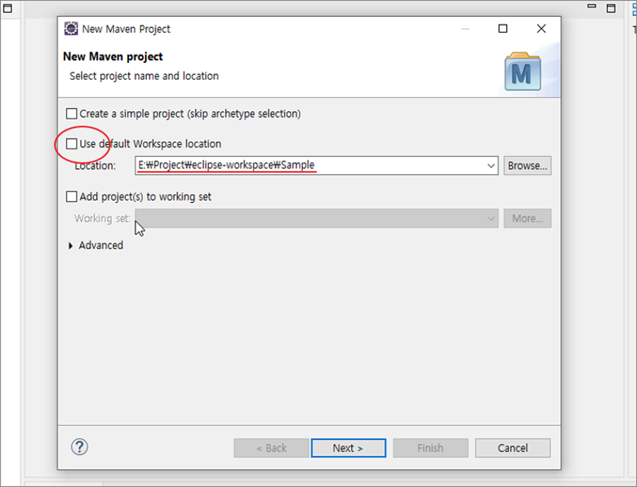 ▼ 다음으로 메이븐 프로젝트의 작업 공간을 지정합니다. 기본 위치가 아닌 사용자가 지정한 곳으로 변경하고 싶다면 Use default Workspace location 체크를 풀고 Location 위치를 변경합니다.