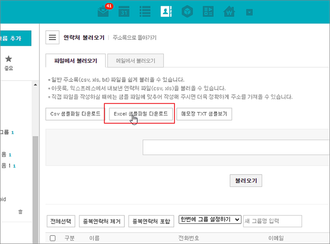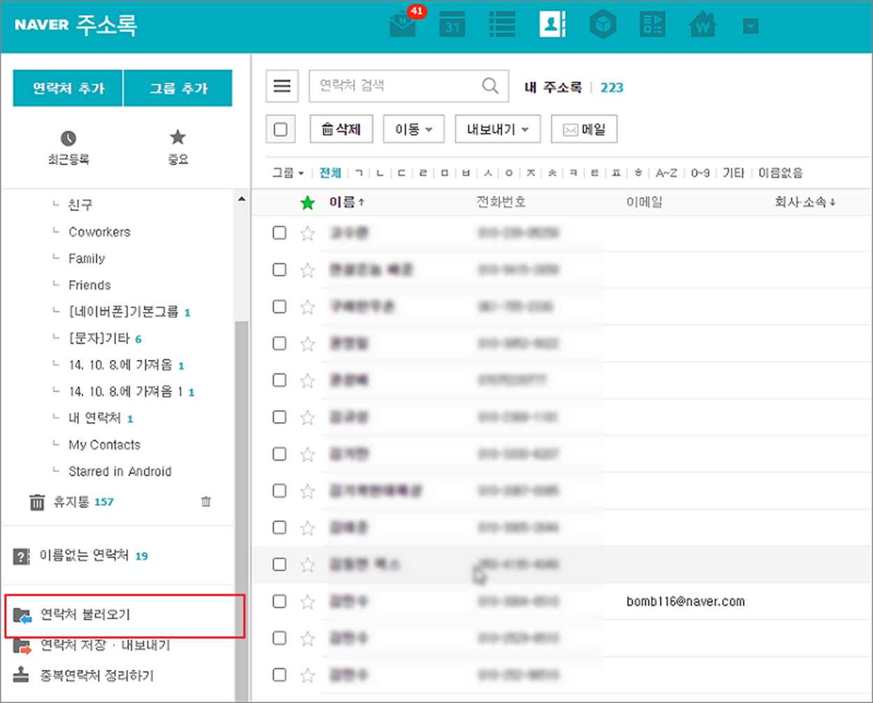 ▼ 주소록 왼쪽 사이드 목록에서 아래로 내려가시면 연락처 불러오기 메뉴를 볼 수 있습니다.