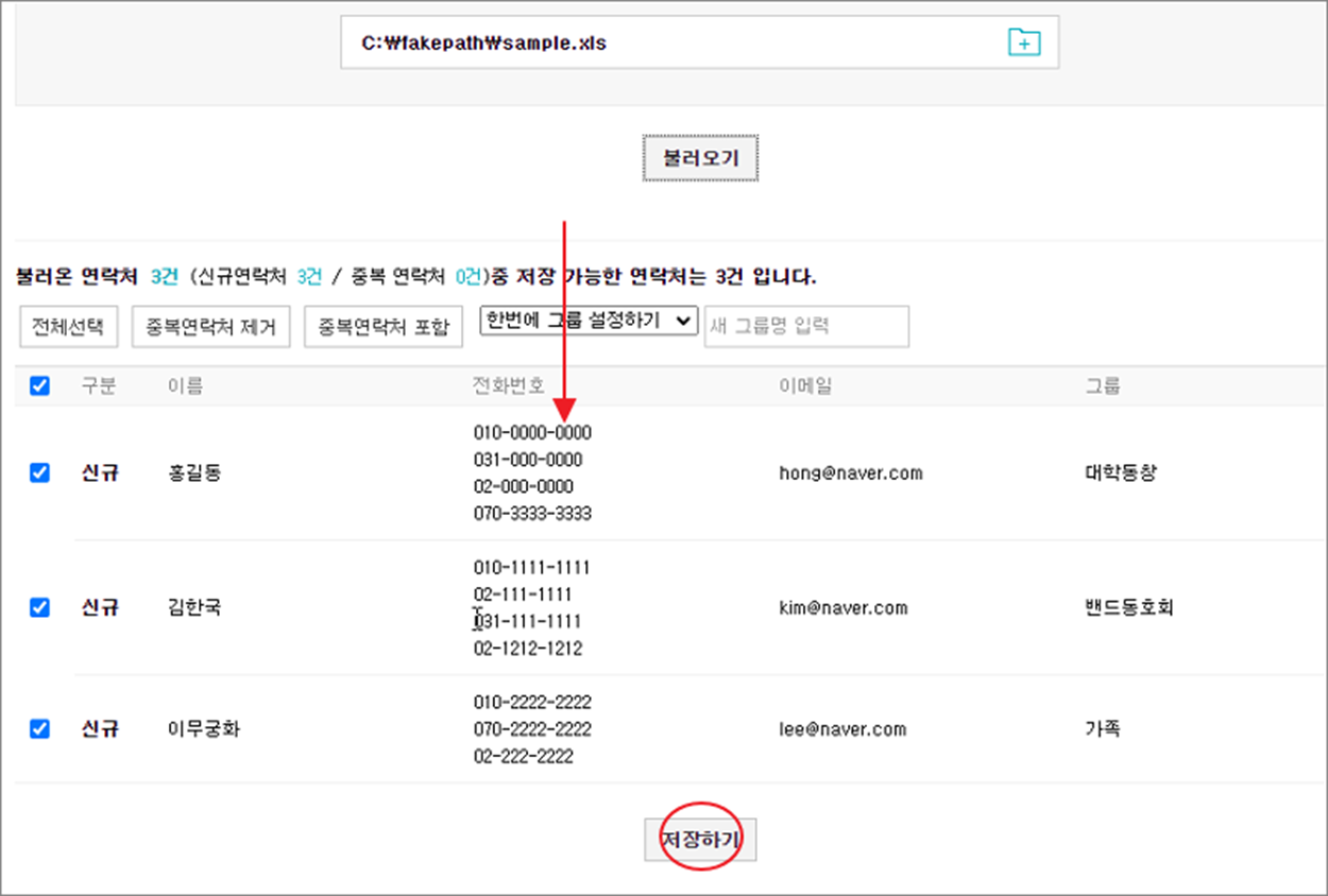 ▼ 파일 불러오기가 끝나면 화면 하단에 정보를 확인할 수 있습니다. 포맷에 맞게 제대로 입력하지 않았다면 바로 확인이 가능하며 불필요한 정보는 선택 체크를 불러 제외시킬 수 있습니다. 확인이 끝났다면 저장하기 버튼을 눌러 주소록 업로드를 진행합니다.