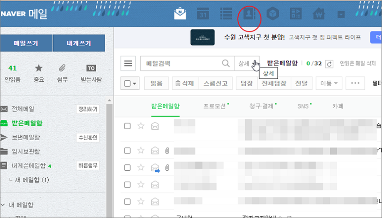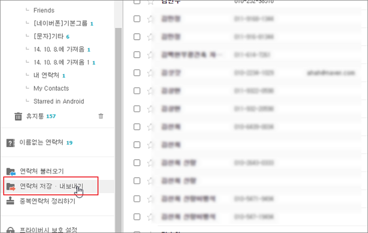 ▼ 다음은 기존 주소 정보를 다운받아서 편집하고 다시 올려보겠습니다. 네이버 주소록 페이지로 이동한 후 왼쪽 사이드에서 연락처 저장/내보내기 버튼을 클릭합니다.