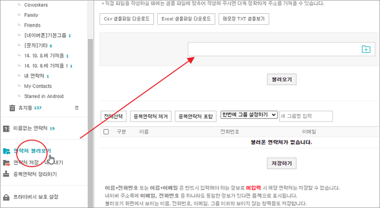 ▼ 정리한 엑셀 파일을 저장하고 네이버 주소록에 올립니다. 네이버 주소록 페이지로 이동해서 파일을 업로드 한 후 불러오기 버튼을 클릭합니다.
