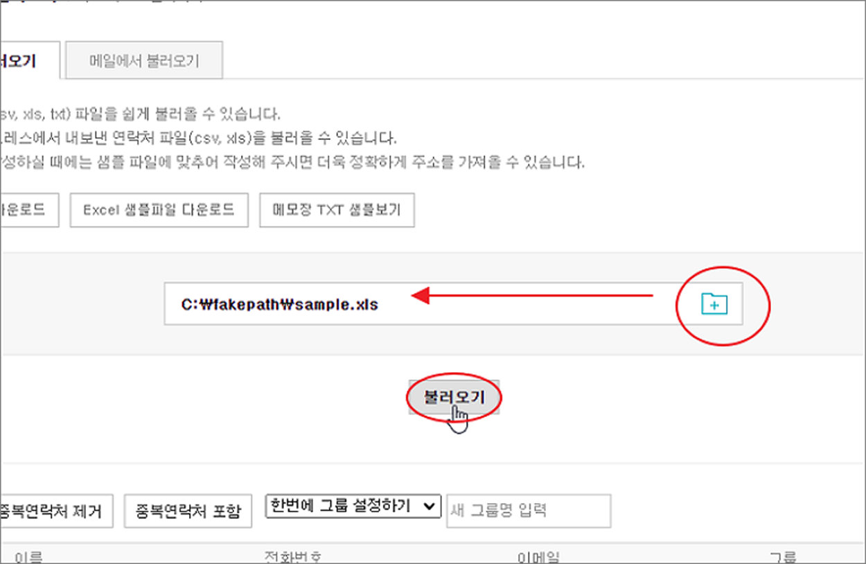 ▼ 이렇게 수정한 정보를 다시 올려서 주소록 정보를 업데이트 하겠습니다. 다시 주소록 > 연락처 불러오기 메뉴를 클릭합니다. 해당 페이지에서 편집한 파일을 추가한 후 불러오기 버튼을 눌러 업데이트 합니다.