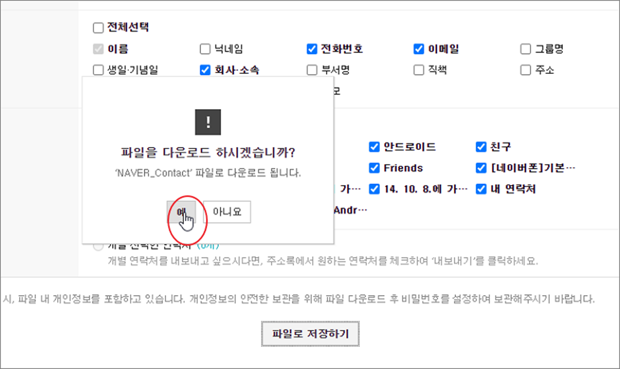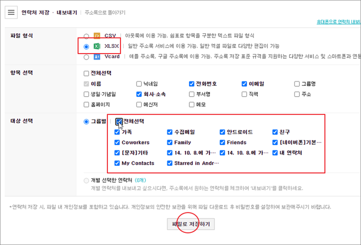 ▼ 연락처 저장 내보내기 화면에서 “파일 형식” 과 항목 그리고 이전 업로드한 종류별 주소록 대상 중 하나를 선택하고 파일로 저장하기 버튼을 클릭합니다.