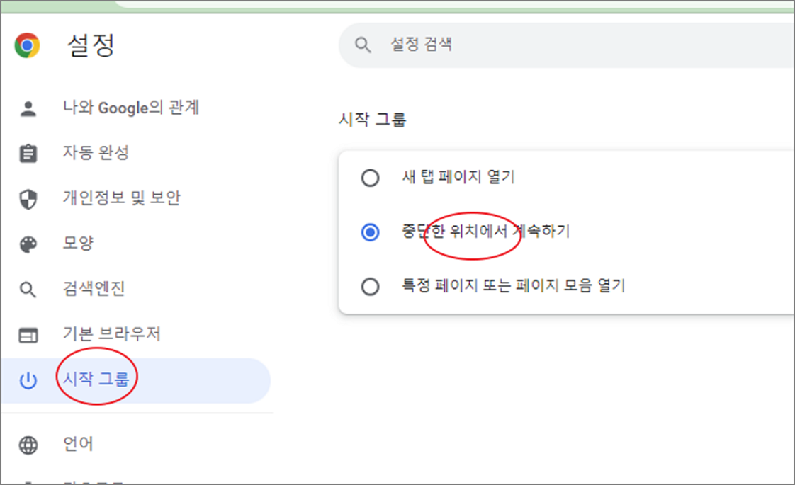 ▼ 설정 화면에서 왼쪽 사이드에 시작 그룹 메뉴를 클릭합니다. 오른쪽 시작 그룹 옵션에서 중단한 위치에서 계속하기 옵션으로 변경합니다. 변경한 옵션은 저장할 필요없이 바로 적용됩니다.