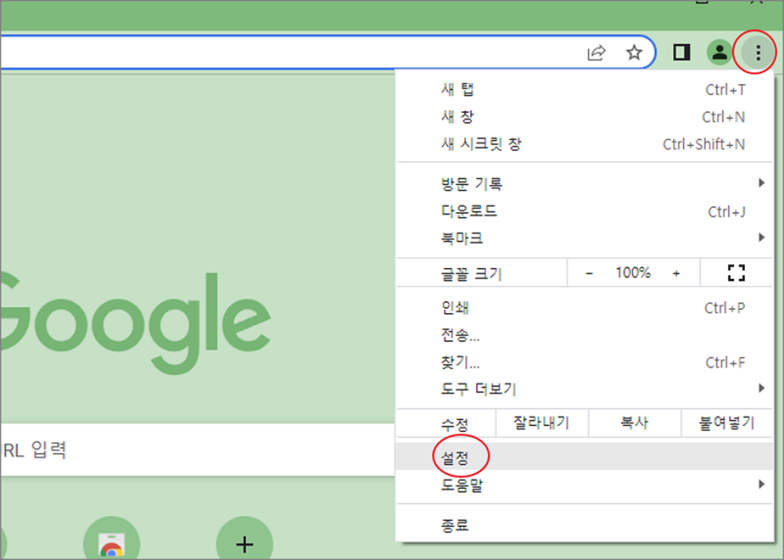 ▼ 이전에 작업하던 탭을 그대로 유지하고 싶다면 설정을 변경해야 합니다. 크롬에서 더보기 > 설정 메뉴를 클릭합니다.