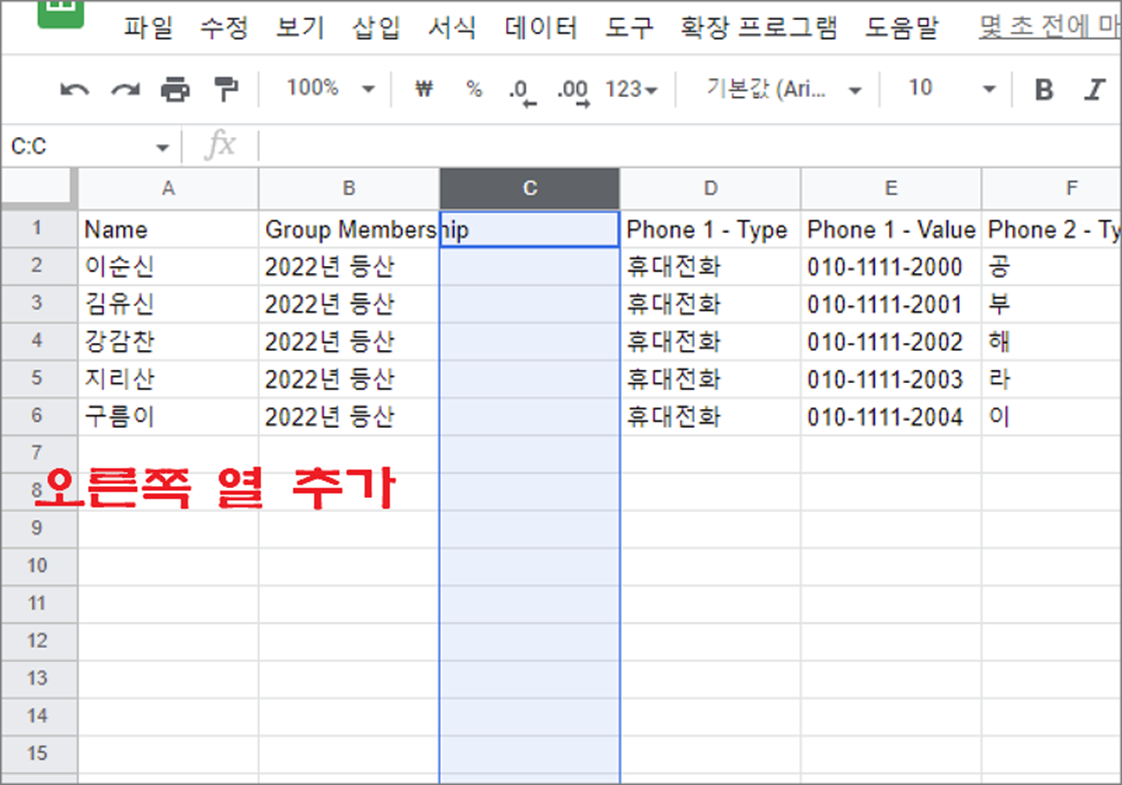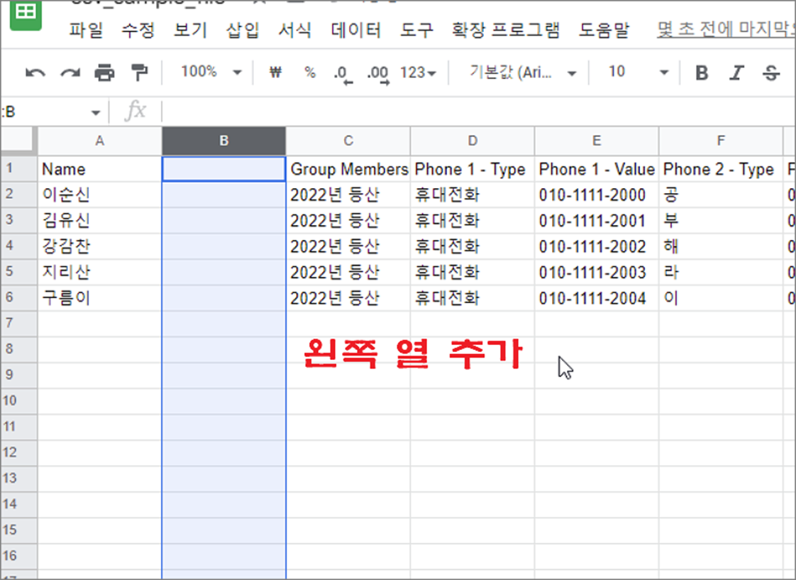 ▼ 그림처럼 선택한 열 왼쪽에 열 하나가 추가된 것을 확인할 수 있습니다.