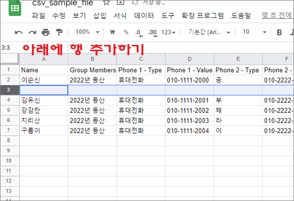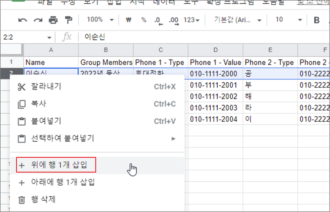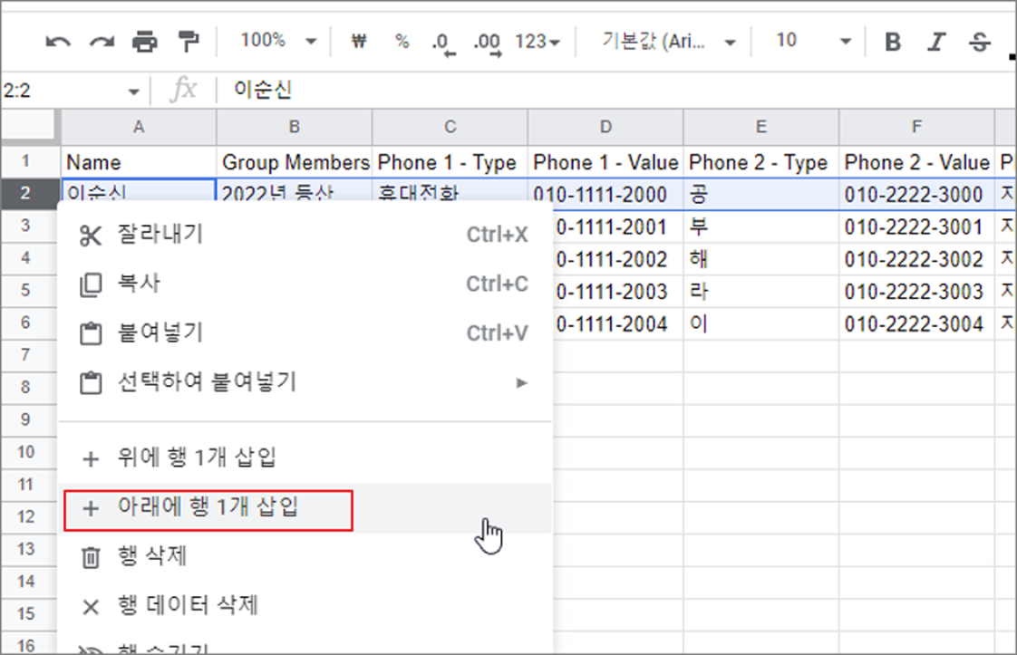 ▼ 행 바로 아래에 추가하기 위해서는 오른쪽 마우스 > 아래에 행 1개 삽입 메뉴를 클릭합니다.