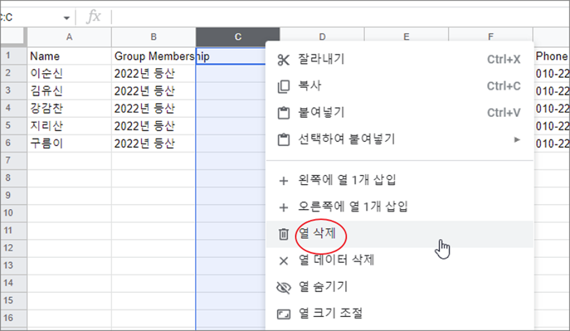▼ 추가한 열을 삭제하는 것도 마찬가지입니다. 삭제할 열을 선택하고 빠른 실행 메뉴인 오른쪽 마우스 > 열 삭제 메뉴를 클릭합니다.