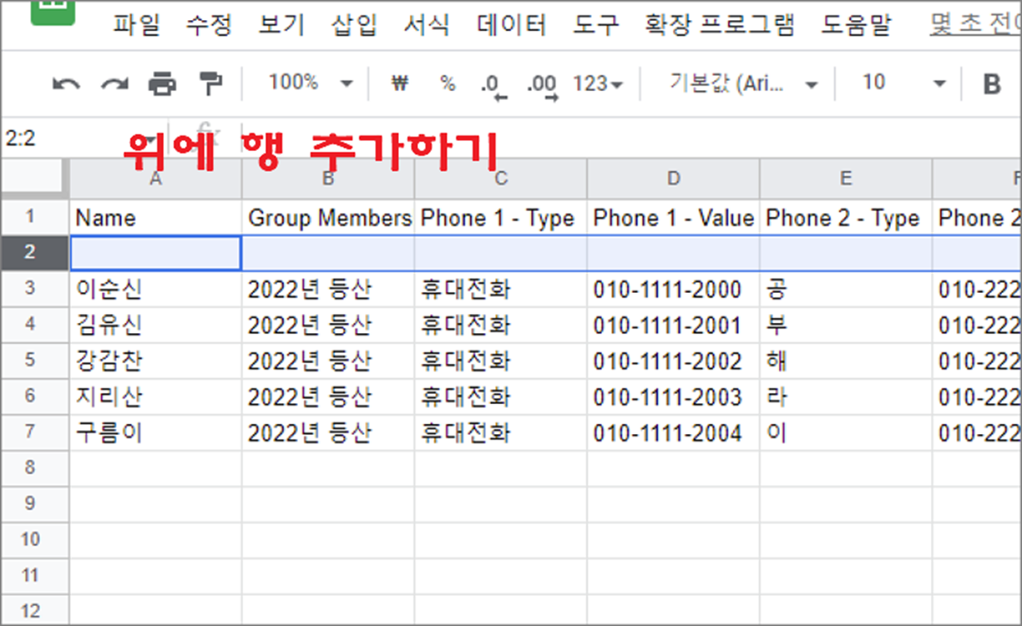 ▼ 결과는 다음과 같습니다. 기준이 되는 행 바로 위에 빈 행이 추가되었습니다.