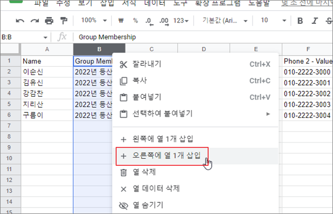 ▼ 다음은 선택한 열을 기준으로 오른쪽에 추가해 보겠습니다. 위와 동일하게 열을 선택하고 오른쪽 마우스 > 오른쪽에 열 1개 삽입 메뉴를 클릭합니다.
