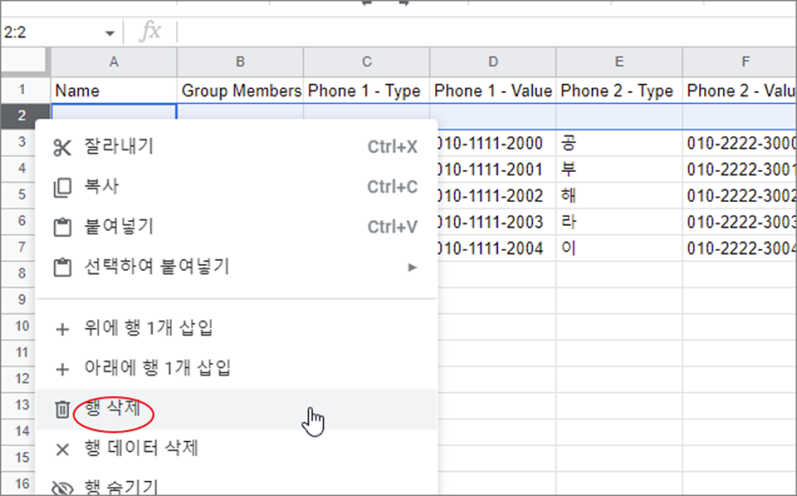 ▼ 행 삭제도 간단합니다. 삭제하고 싶은 행을 선택하고 오른쪽 마우스 > 행 삭제 메뉴를 클릭합니다.