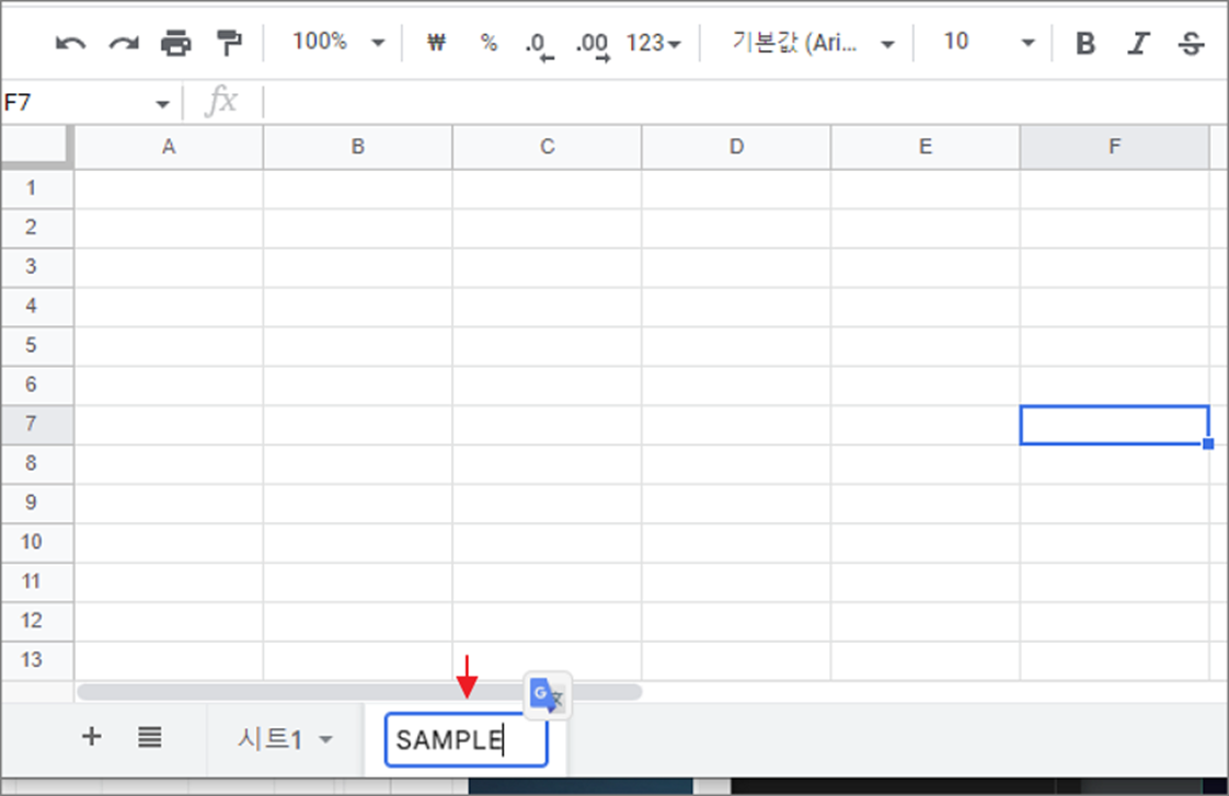 ▼ 시트 탭이 이름 변경이 가능한 에디터 창으로 바뀝니다. 원하는 이름으로 변경하고 Enter 를 눌러 수정을 완료합니다.