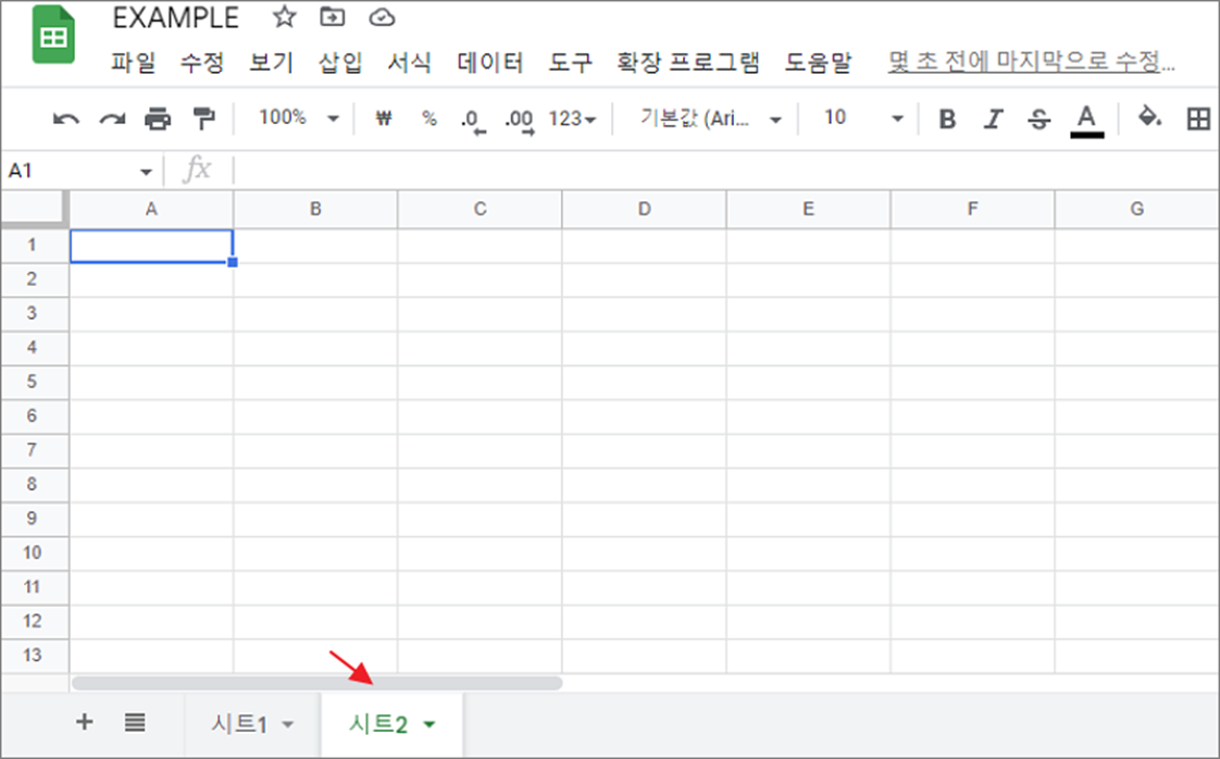 ▼ 그림처럼 새로운 시트를 첫 번째 시트 오른쪽에 추가했습니다.
