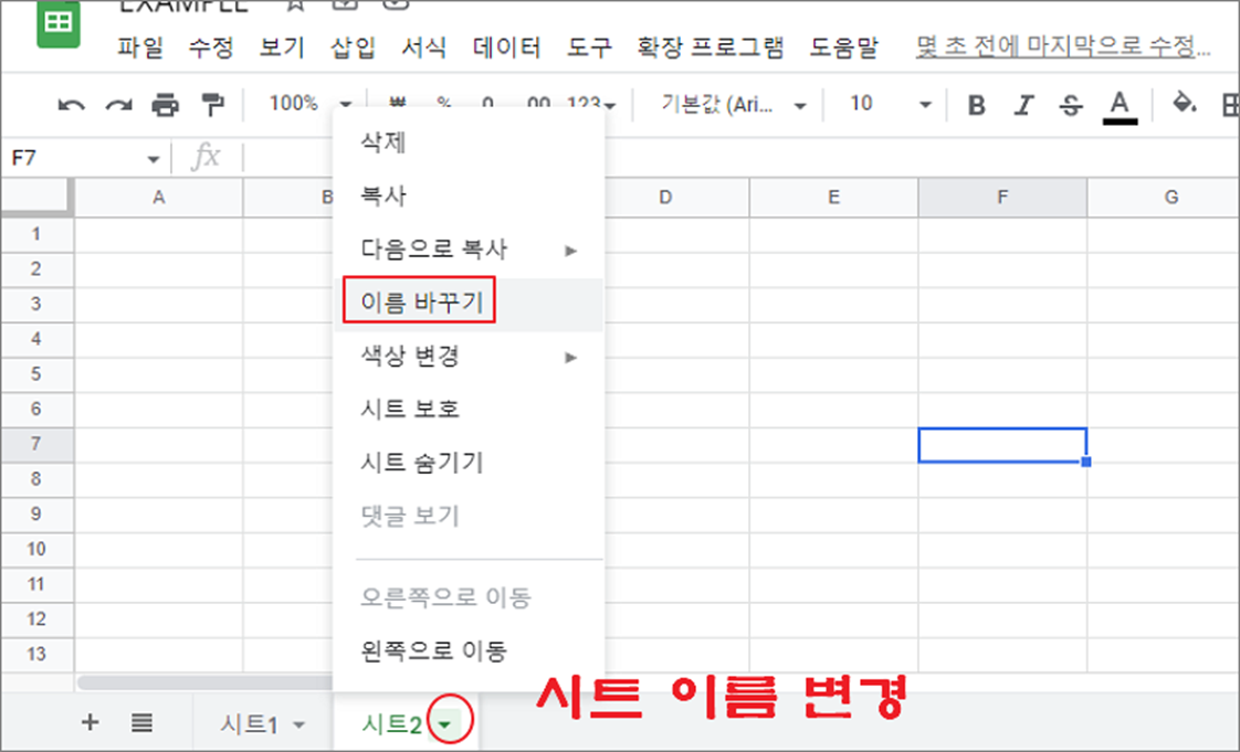 ▼ 다음은 시트에 적힌 이름을 변경해 보겠습니다. 시트 탭 오른쪽 화살표를 눌러 메뉴 창을 띄웁니다. 그리고 이름 바꾸기를 클릭합니다.