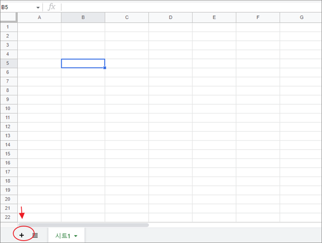 ▼ 통합 문서에서 시트를 추가하기 위해서 화면 아래로 내려갑니다. 왼쪽 끝에 + 버튼을 클릭해서 시트를 추가합니다. 단축키는 Shift + F11 입니다.