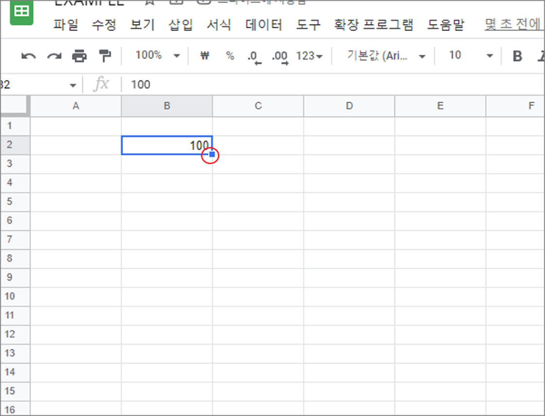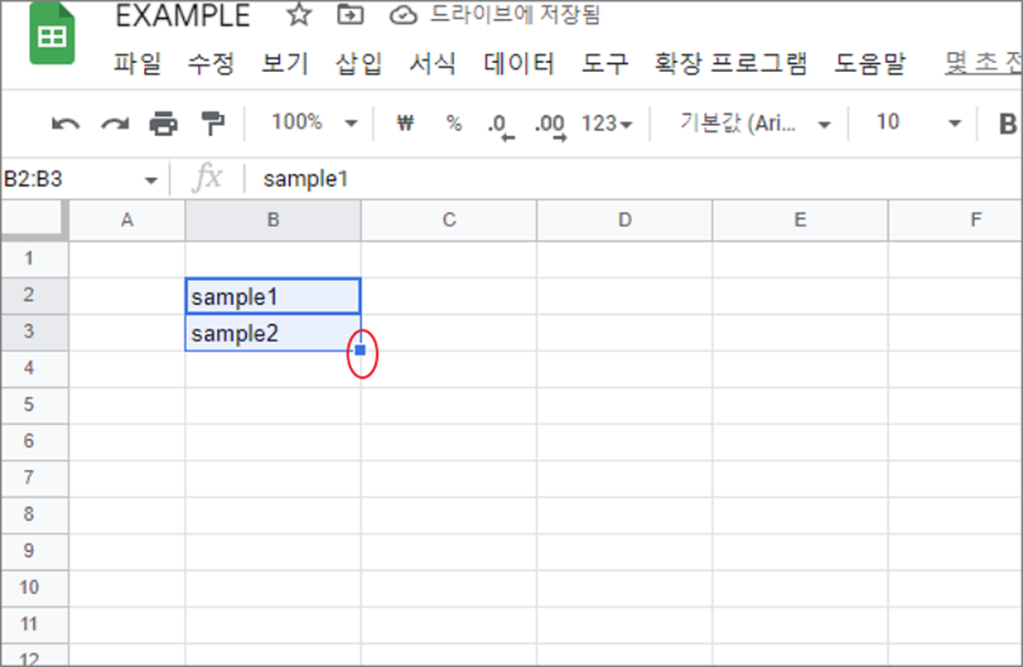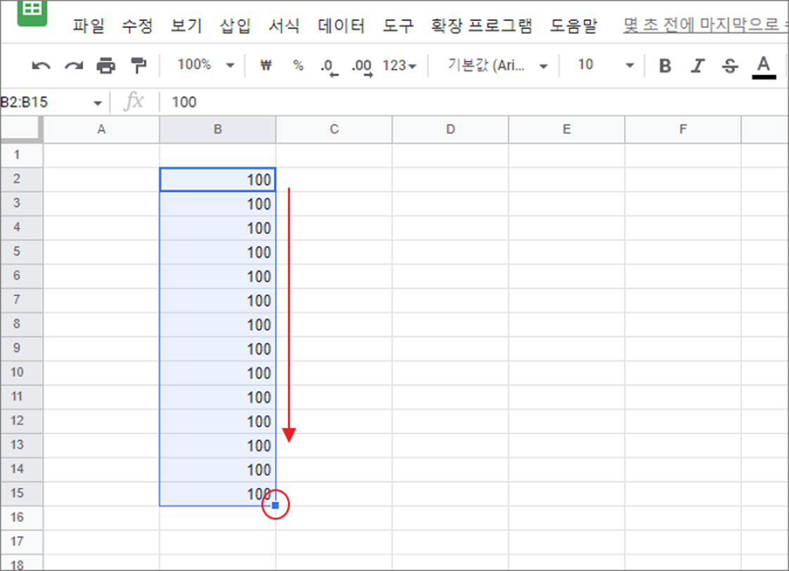스프레드시트에서 데이터 채우기는 가장 많이 사용하는 기능입니다. 수식이나 데이터를 한 번에 자동으로 채워 넣을 수 있기 때문입니다. 데이터 채우기 기능은 셀을 선택했을 때 오른쪽 하단에 조그마한 사각형인 채우기 핸들을 이용합니다. 셀을 선택하고 채우기 핸들을 마우스를 클릭한 채 끌어서 범위를 선택한 다음 놓으면 끝납니다.