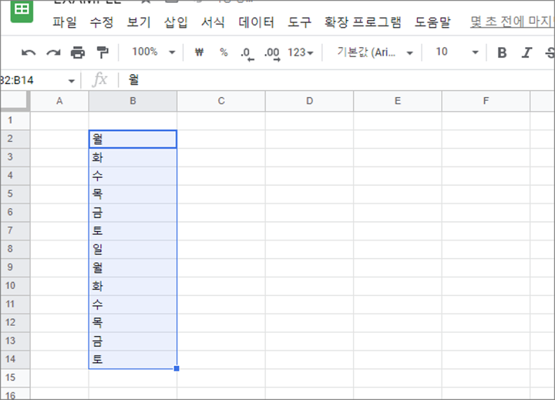 ▼ 그림처럼 월 ~ 일요일까지 자동으로 채웠습니다. 우리가 흔히 통용하고 있는 패턴은 모두 적용 가능합니다.