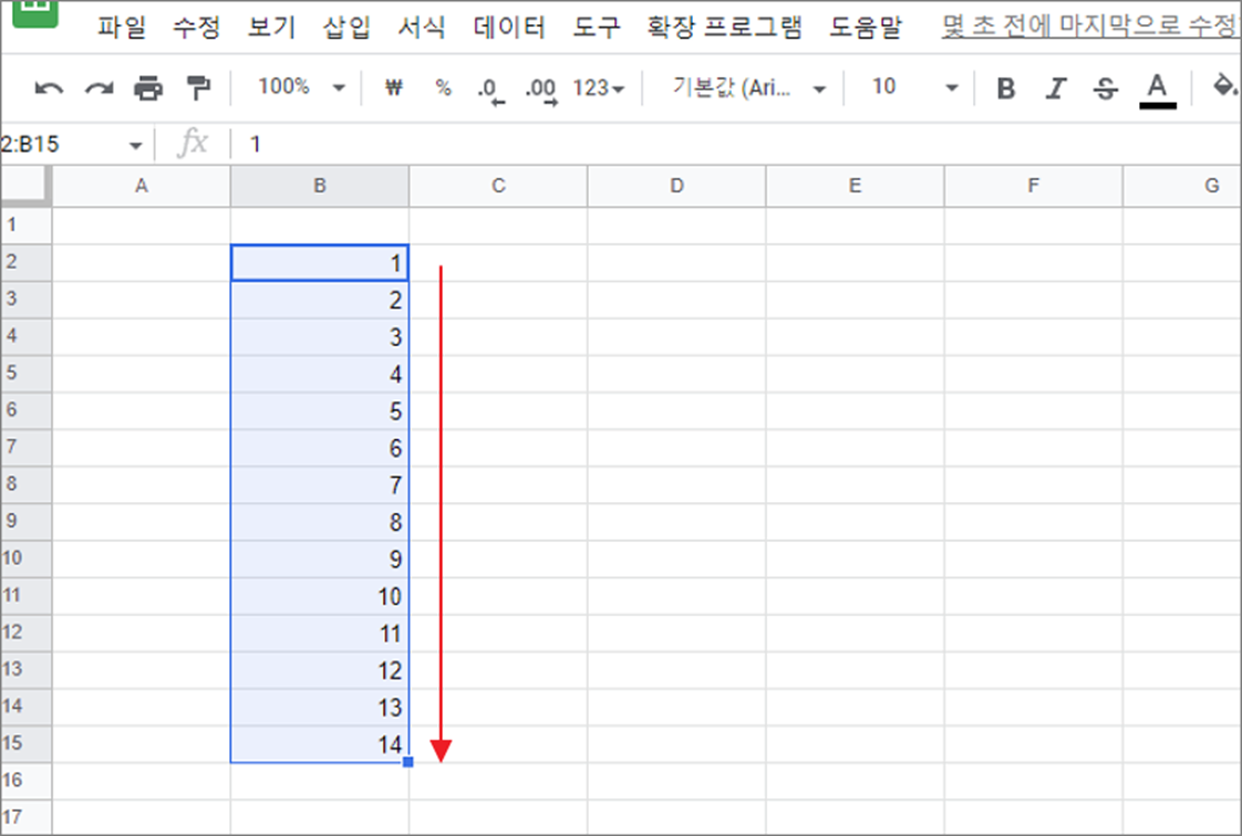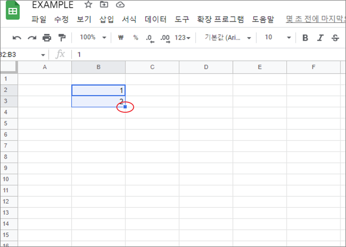 ▼ 채우기 기능을 이용해서 숫자의 자동 증가 값을 채워보도록 하겠습니다. 숫자 증가 패턴을 인식할 수 있도록 두 개의 셀에 1, 2 입력합니다. 그리고 채우기 핸들을 끌어서 아래쪽이나 옆으로 드래그 합니다.