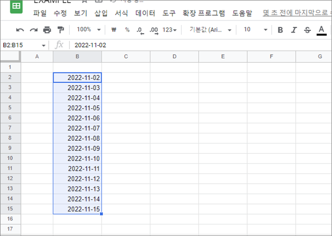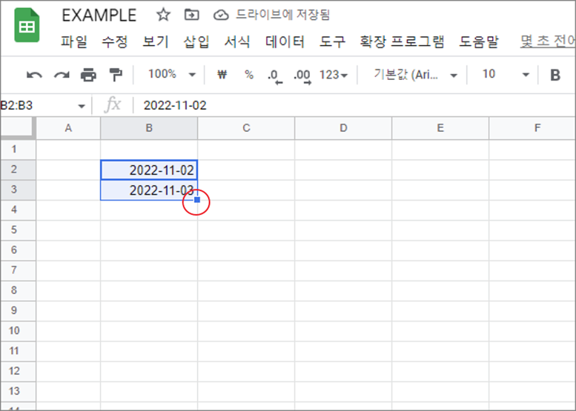 ▼ 다음은 날짜를 채워보겠습니다. 날짜도 숫자를 증가시키는 것처럼 패턴에 맞게 자동으로 채울 수 있습니다. 날짜 형식으로 데이터를 넣고 선택한 다음 채우기 핸들로 드래그 합니다.