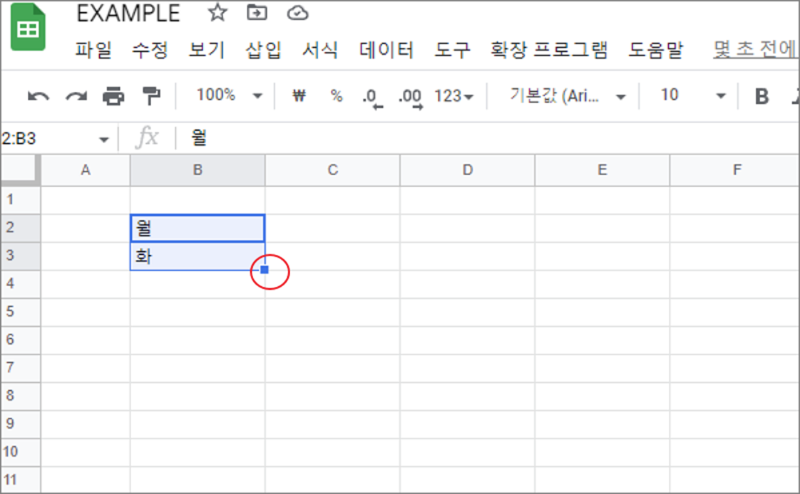 ▼ 요일은 어떨까요? 월, 화를 입력하고 채우기를 해 보세요. 요일도 내부에 패턴을 저장하고 있어서 자동으로 채울 수 있습니다.