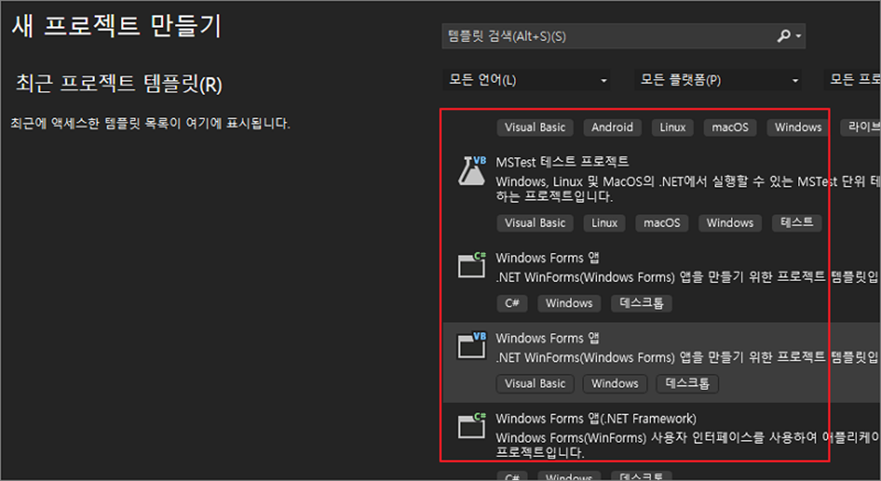 ▼ 다음 프로젝트 만들기에서 개발 플랫폼을 선택합니다. 이전에 커뮤니티 설치 첫 화면에서 선택한 프레임워크가 목록에 나타납니다. NET 데스크톱 개발 항목도 선택했기 때문에 목록에서 Windows Forms 앱을 볼 수 있습니다.