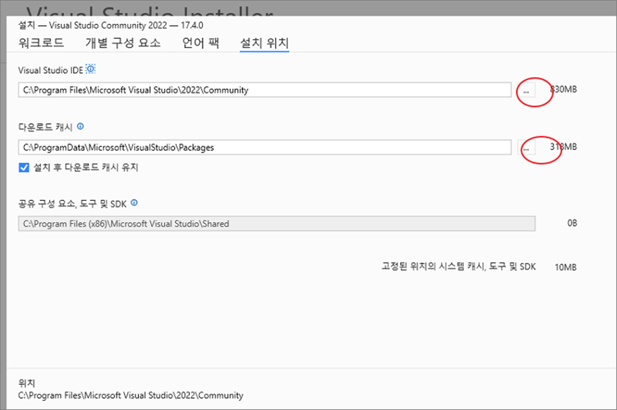 ▼ 기본적인 설치 위치는 OS 가 있는 C 드라이버 입니다. 해당 공간이 여유가 없다면 상단 탭 설치 위치로 이동해서 패키지 설치 위치를 수정해야 합니다.