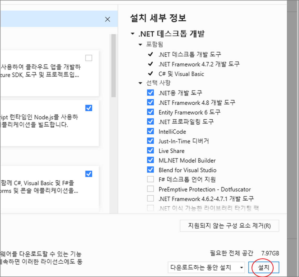 ▼ 체크한 프로그램은 오른쪽 설치 세부 정보에 나타납니다. 개발도구와 선택 가능한 항목, 전체 파일의 크기 등을 볼 수 있습니다. 모두 확인했다면 설치 버튼을 클릭합니다.