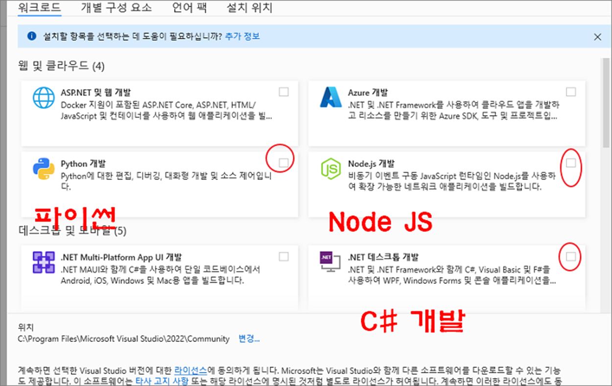 ▼ 설치 툴 화면이 뜨면 C# 개발을 위한 프레임워크와 파이썬, Node JS 등 필요한 것들을 체크합니다.