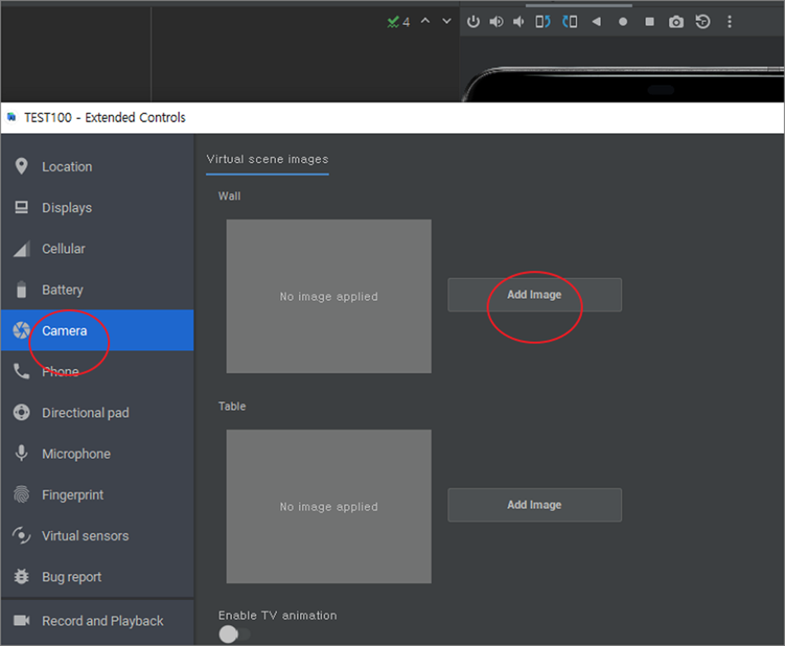 ▼ 다음 에뮬레이터 설정창이 뜨면 Camera 메뉴를 선택합니다. 그리고 Camera 상세 화면에서 Add Image 버튼을 눌러 QR 코드 이미지를 추가합니다.