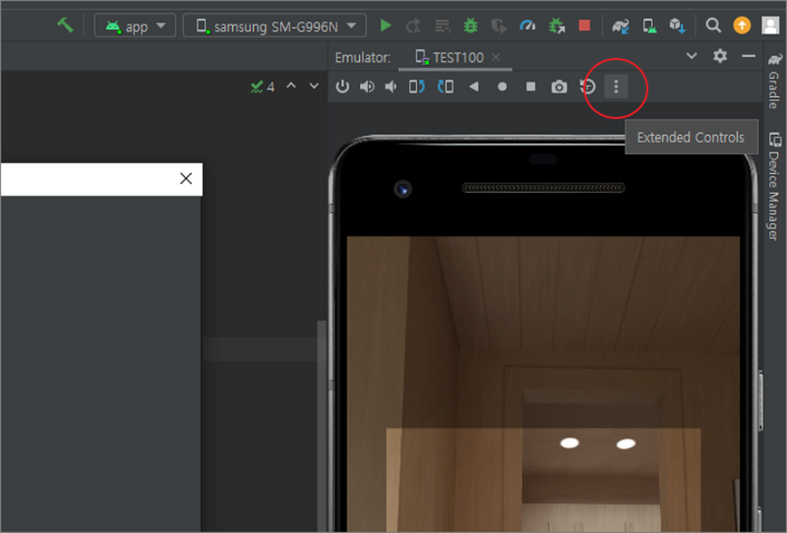 ▼ 앱에서 카메라를 실행하기 전에 QR 코드 테스트할 이미지를 에뮬레이터에 추가해야 합니다. 에뮬레이터 관리창 상단에 더보기 메뉴를 클릭합니다.