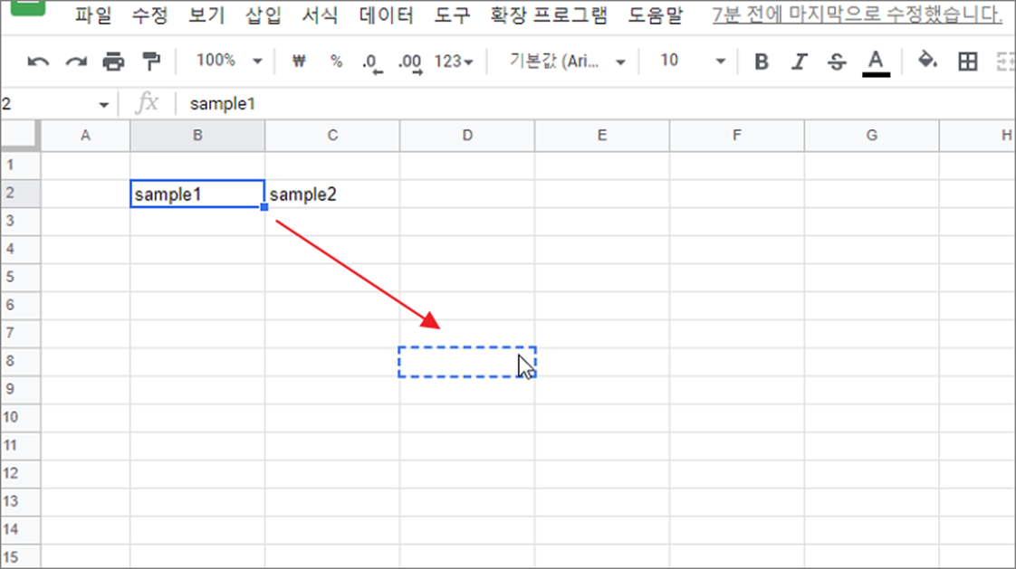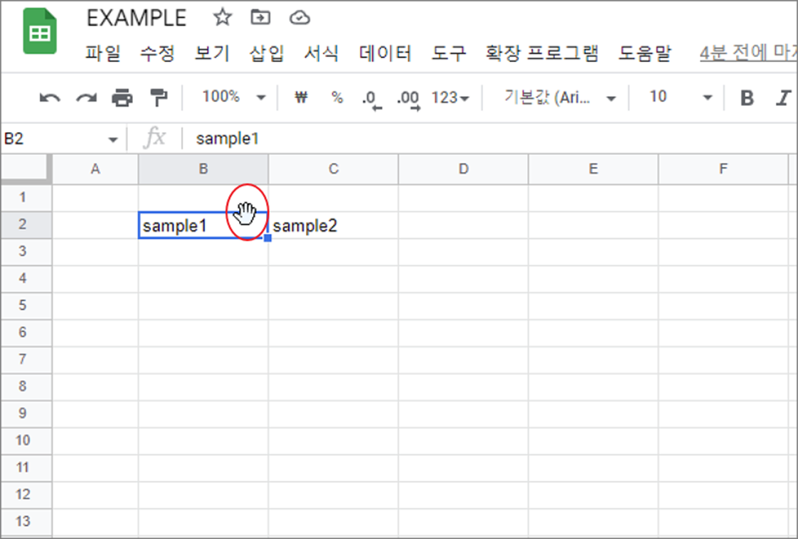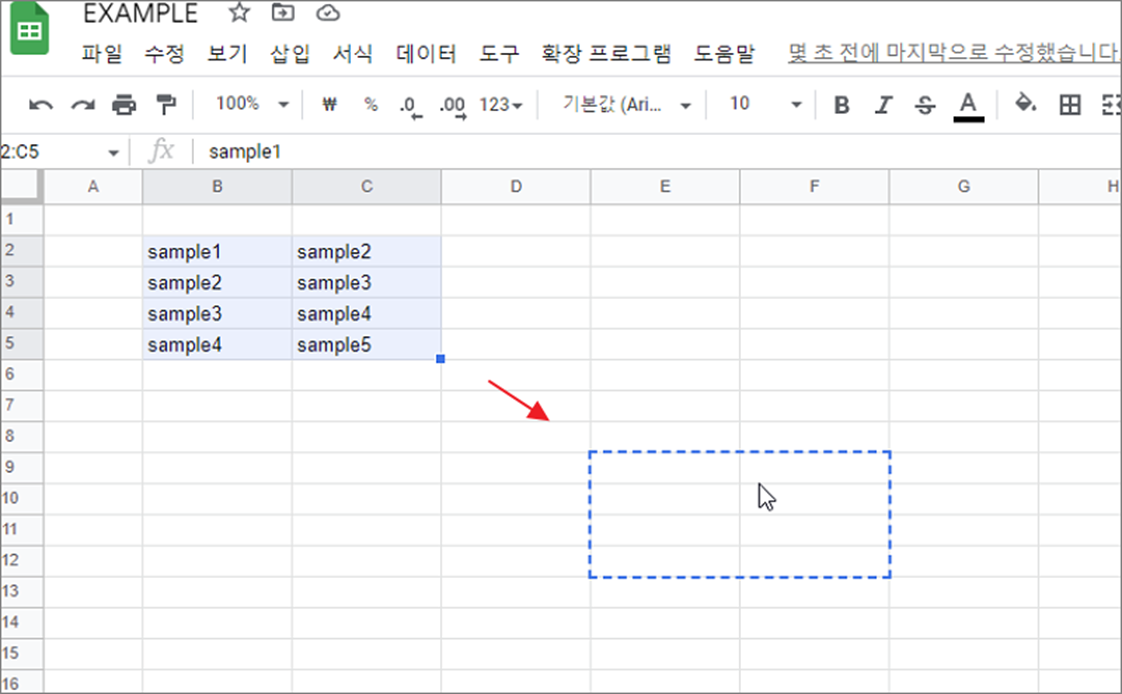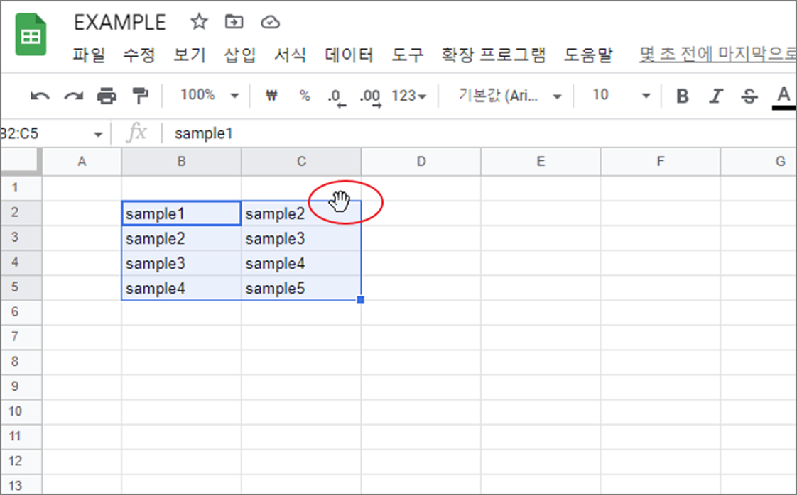 스프레드시트에서는 셀에 있는 데이터를 드래그해서 옮길 수 있습니다. 엑셀처럼 단일 셀 뿐만 아니라 선택한 영역을 드래그해서 한번에 원하는 위치로 이동이 가능합니다. 엑셀과 다른 점은 드래그 가능한 라인 위치에서 마우스 포인트가 손 모양으로 바뀐다는 것입니다.